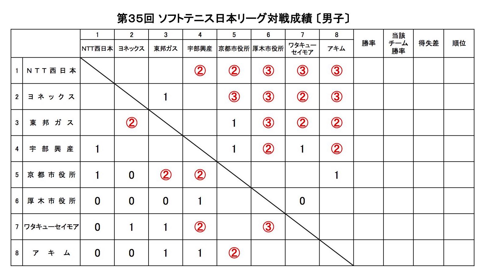 男子は8連覇を目指すNTT西日本が本日も全勝で5勝をマーク。本日最終対戦の5対戦目でヨネックスは東邦ガスに敗れ、ヨネックスと東邦ガスが4勝1敗とNTT西日本に続く展開に。宇部興産、京都市役所、ワタキューセイモアは2勝3敗と並んでいる。