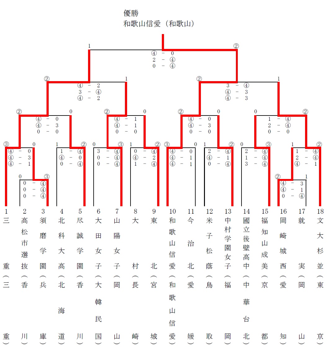 決勝は、三重の竹田真樹(2年)/藤城みちる(1年)が和歌山信愛の多田千夏(1年)/岩﨑彩(2年)を0に抑えて先勝したが、松井玲奈(2年)/川﨑海奈(1年)が2番で勝利し勝負をタイに。
