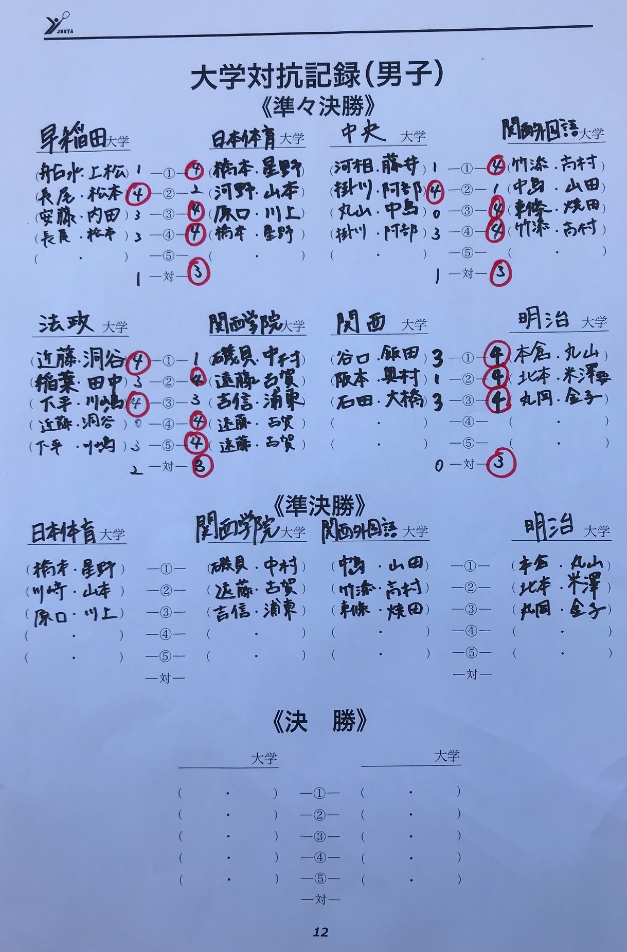 男女ともに準決勝は関西vs関東の対決となる。準々決勝の結果と、準決勝のオーダーは以下の通り。