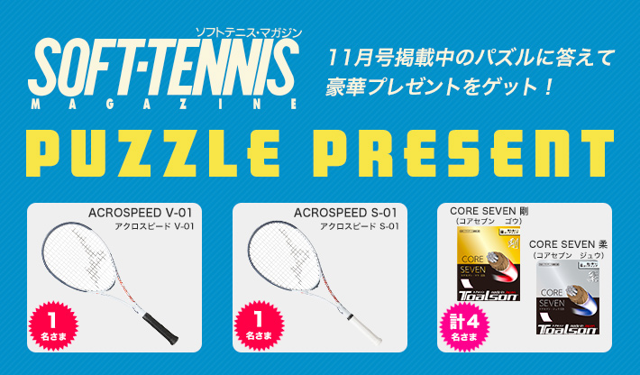ソフトテニス・マガジンでは、正解者に抽選でメーカーからプレゼントがもらえるクロスワードパズルを掲載しています。こちらはソフトテニス・マガジン本誌に掲載されたパズルにお答えいただくためのページです。ソフトテニス・マガジンのご購入は、最寄りの取扱い書店か、こちらのページからもご注文いただけます。