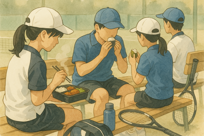 ・補食:試合の合間には、バナナ、エネルギーゼリー、おにぎりなど消化の良い糖質中心のものを少量ずつ。
