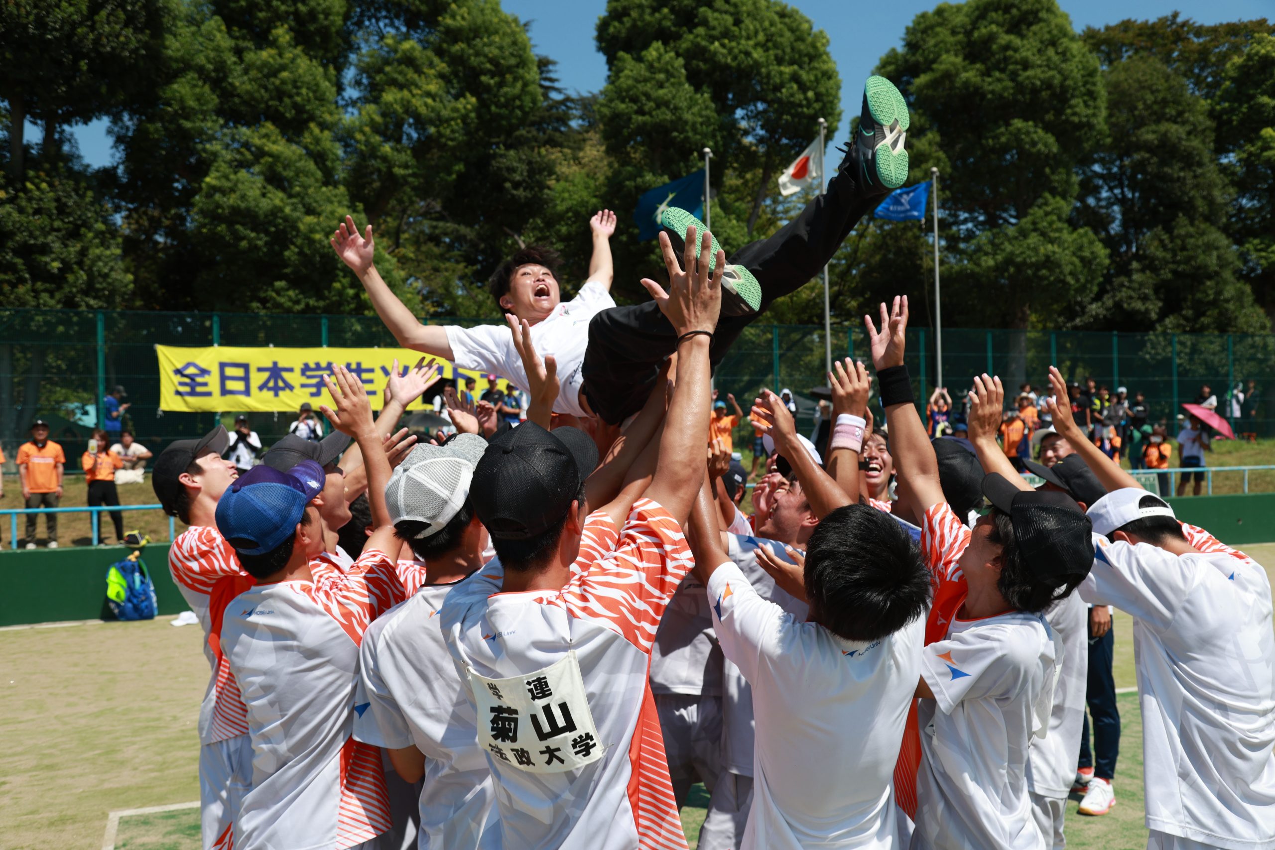 「高田商業の時のインターハイで悔しい思いをして、大学では日本一になりたいという気持ちで法政に入って、この環境は自分に合っているなと思いました。周囲からいい刺激をもらいながら、2年の団体戦で4本に入り、その時ぐらいから日本一が見えるようになってきました。ちょうど橋場らも入ってきて、昨年も日本一を取れるんじゃないかと思っていましたが、決勝で早稲田に0で負けて。何か違うなというのはありました。自分もあと1年しかない。みんなの推薦でキャプテンにしていただいて、去年のいいところを引き継ぎながら、自分にしかない何かを出せればいいと思っていました。日本一取るには今年しかない。結果的には自分が何かしたかというよりも、後輩たちが勝ちたい気持ちを持って、1年間テニスに向き合ってくれたから優勝できたと思います。内藤、桑山みたいに背中を見せられたかと言えばそうとは言いきれない。でも本当の最後だけは後輩たちに見せられたなと。濃い4年間でした」