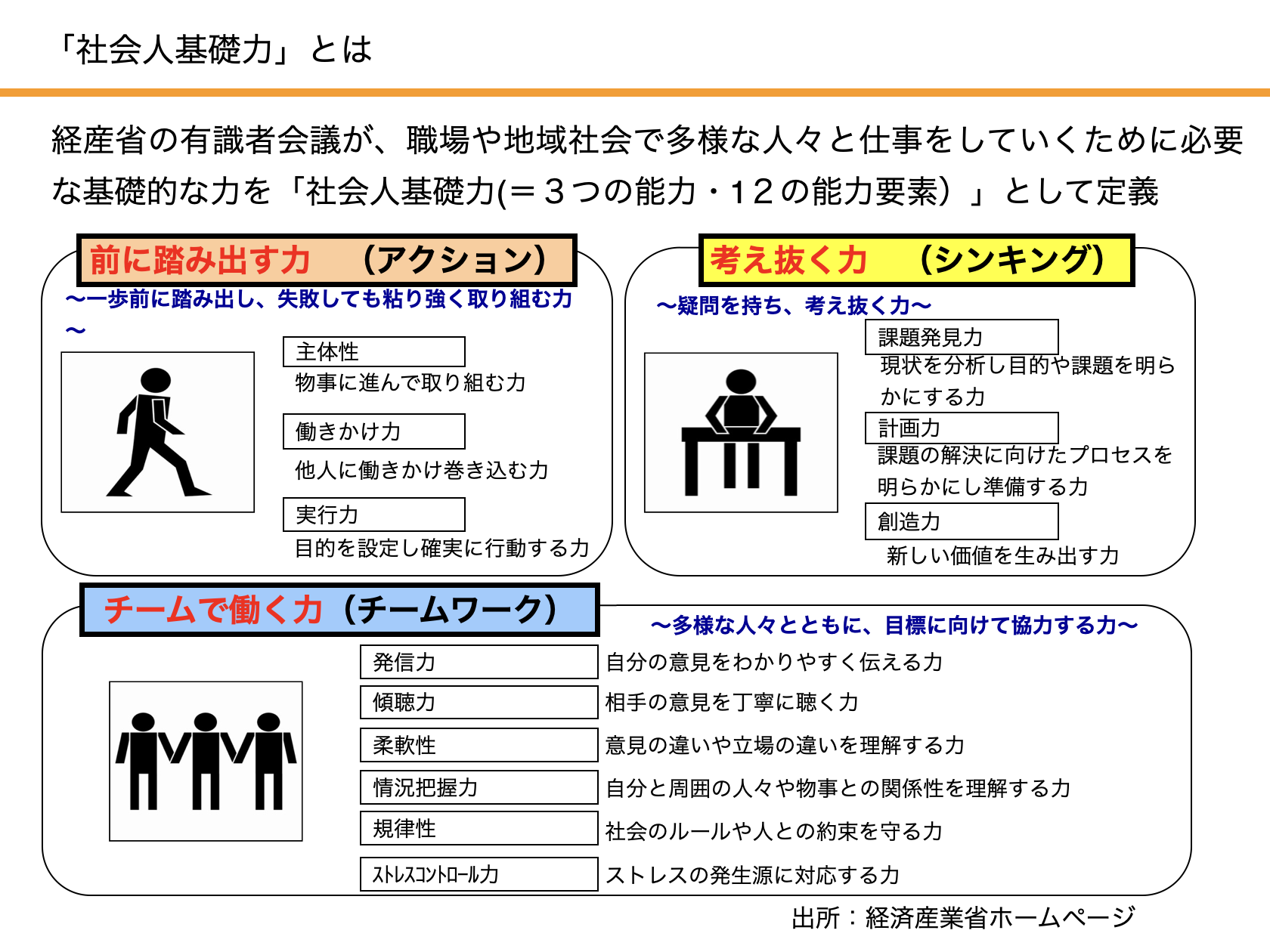 下図のように、3つの能力とは、「前に踏み出す力(アクション)」「考え抜く力(シンキング)」「チームで働く力(チームワーク)」です。「前に踏み出す力」には、「主体性、働きかけ力、実行力」の3つの能力要素が含まれます。「考え抜く力」には、「課題発見力、計画力、創造力」の3つが、「チームで働く力」には、「発信力、傾聴力、柔軟性、情況把握力、規律性、ストレスコントロール力」のつが含まれます。この12の要素が、社会人になる準備として、身につけたい基礎力です。