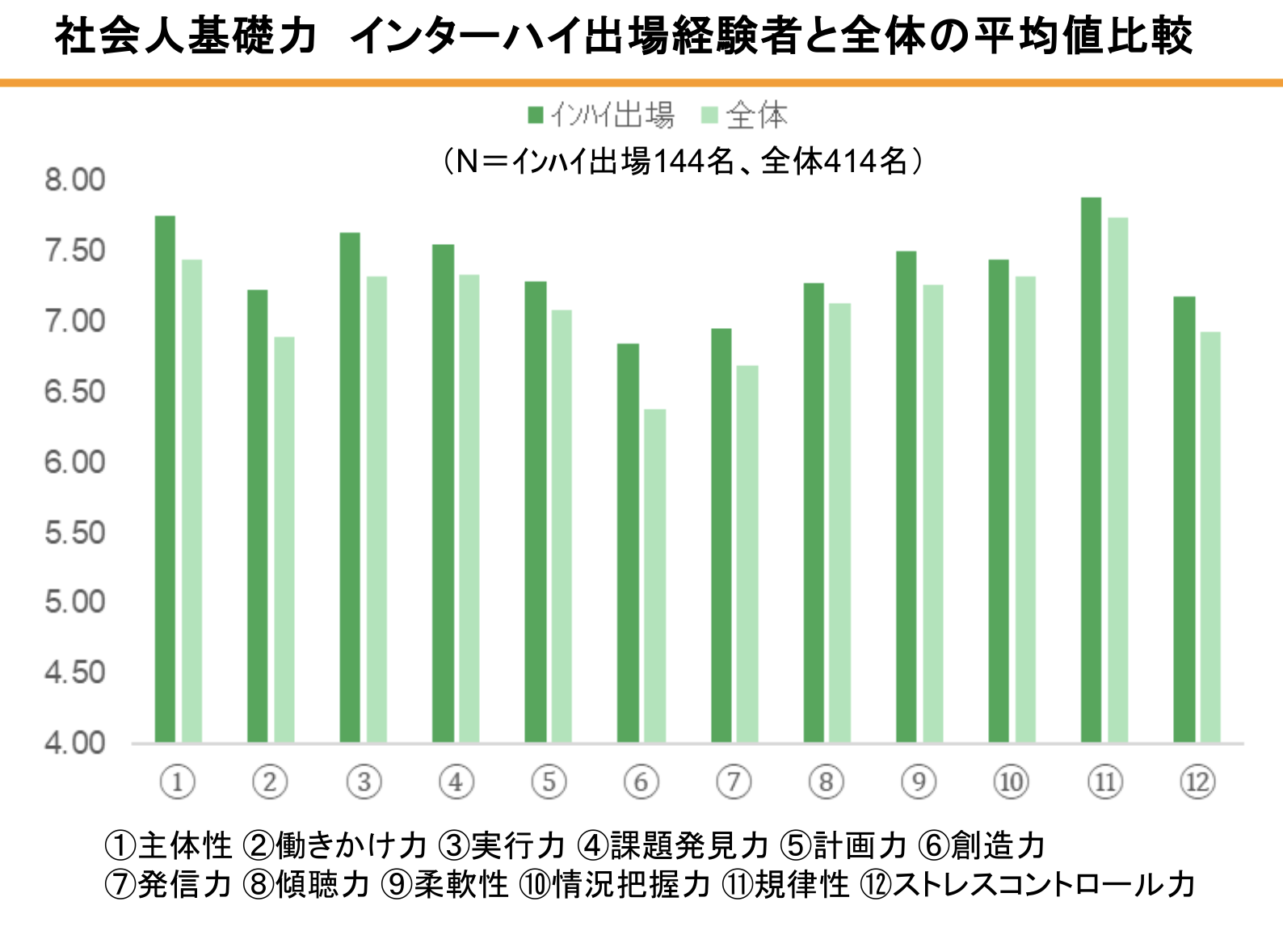 さて上図は、前回までにご紹介した「社会人基礎力」について、高校でインターハイに出場経験のある大学ST部経験者(144名)と、大学ST部経験者全体(414名)の平均値を比較したものです。12項目の社会人基礎力について、「9:完全にあてはまる」から段階的に、「1:完全にあてはまらない」までの9段階の自己評価です。図で明らかなことは、12項目すべてにおいて、インターハイ出場経験者の方が、全体平均より高かったのです。これは、高校時代までにスポーツで高い目標を掲げ、日々厳しい練習を重ね、その結果としてインターハイに出場した人たちが、(大学での競技成績は別として)、インターハイには出場できなかった人を多く含む全体平均と比べて、社会人基礎力の自己評価が高かったということです。